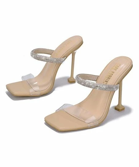 Add chic style to your look with these heeled sandals crafted with rhinestone accents and a square toe design.