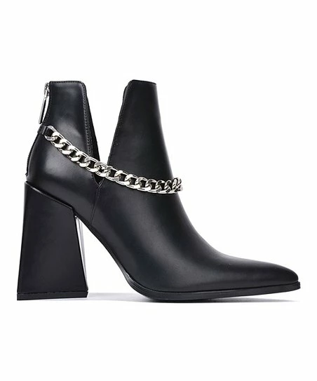March to a stylish beat in these heeled booties serving up a cutout shaft that shows off your ankles and a slinky chain accent.