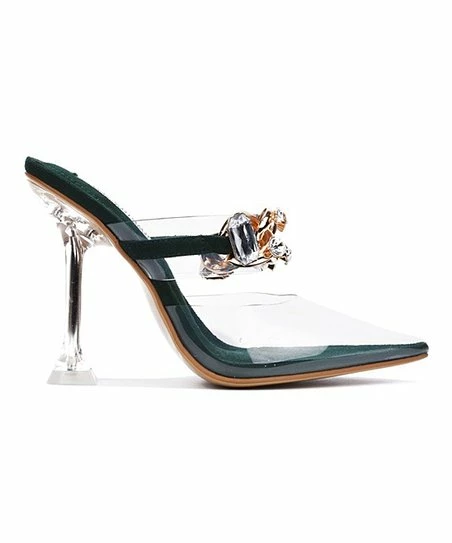 Take a stylish stance in these pointed-toe mules featuring a clear vamp, Lucite heel, and gemstone accents.