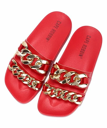 Featuring gleaming goldtone chain accents, these edgy slides are sure to become a warm-weather favorite.